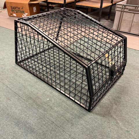 Hundbur i svart metallgaller med sned bak- och framkant, anpassad för placering i bilens bagageutrymme. Buren har dörr fram med låsmekanism och är tillverkad i robust metallnät som ger god ventilation och insyn.