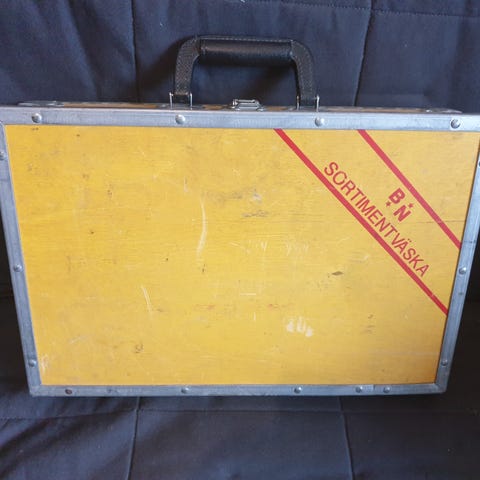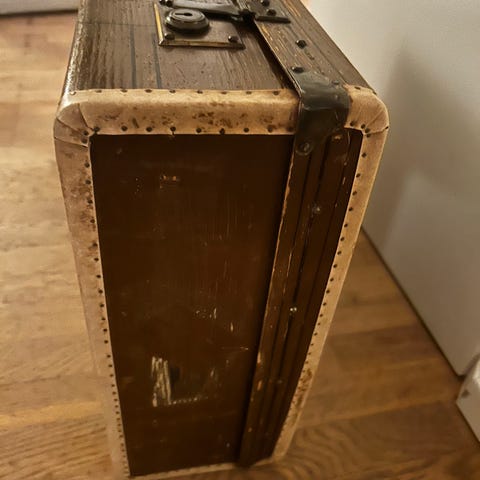 Den är sliten, använd, några gammal reselappar sitter kvar med året 1976 på