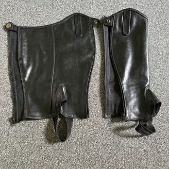 Svarta chaps för ridning i läder. Chapsen täcker underbenet och fästs med rem under foten samt tryckknappar upptill. Elastiska partier längs sidan ger bättre passform runt vaden. Passar att använda över ridstövlar eller ridskor för extra skydd och stöd.