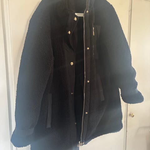Jackan är svart och tillverkad i polyester med mjuk, teddyliknande utsida och quiltat foder på insidan. Modellen har dragkedja framtill, hög krage och flera detaljer i metall. Passar som vardagsjacka under svalare väder.