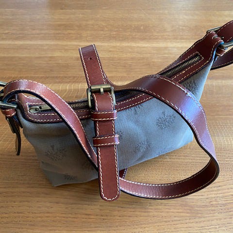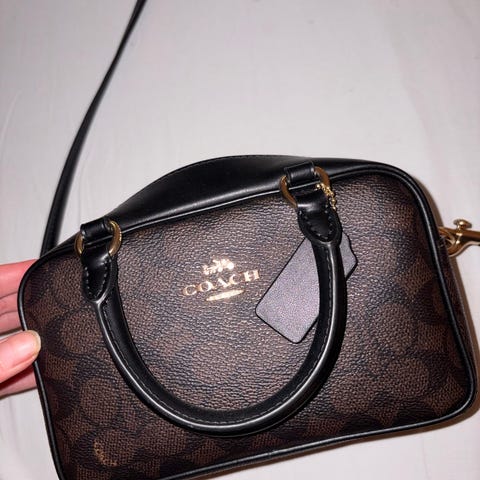 Coach axelremsväska i tyg för kvinna. Väskan har ett mönstrat yttertyg i bruna och beige toner med Coach-logga, justerbar axelrem i brunt material och dragkedja upptill. Framtill och på baksidan finns ytterfack och insidan har fodrat fack med etikett från Coach. Passar för vardagsbruk och för att bära mindre tillhörigheter som mobil, pass, plånbok och nycklar. Köpt på Los Angeles flygplats för några år sedan, men den kom inte till användning.
