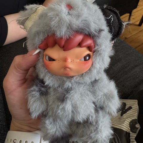 Mjukdjur i form av en sittande katt i grå färg med mörkare ränder och röda detaljer på öronen. Ansiktet är utformat med leende uttryck och målade detaljer. Runt halsen finns ett enkelt band. Passar som prydnad eller leksak. Storlek uppskattas till mindre modell, lämplig att ställa på hylla eller bord.H 18cm