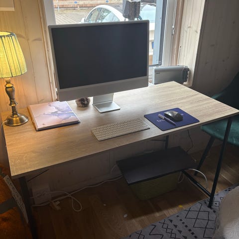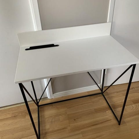 IKEA skrivbord i svart med rektangulär bordsskiva och metallben. Bordet har en upphöjd bakkant med genomföringshål för kablar, vilket underlättar kabeldragning för dator och annan elektronik. Passar som arbetsbord eller skrivbord i hemmet eller på kontor. Bordsskivan är slät och benen är utförda i metall med enkel, rak konstruktion för stabilitet.