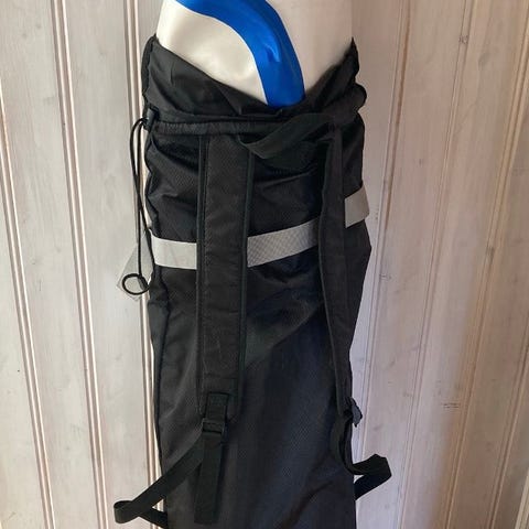 Hydrapak vätskeryggsäck med tillhörande vätskeblåsa och slang. Ryggsäcken är svart med justerbara axelremmar och bröstrem. Vätskeblåsan är blå med röd skruvkork och ansluts till en blå dricksslang med munstycke. Passar för aktiviteter som löpning, cykling och vandring där man vill bära med sig vätska på ryggen.