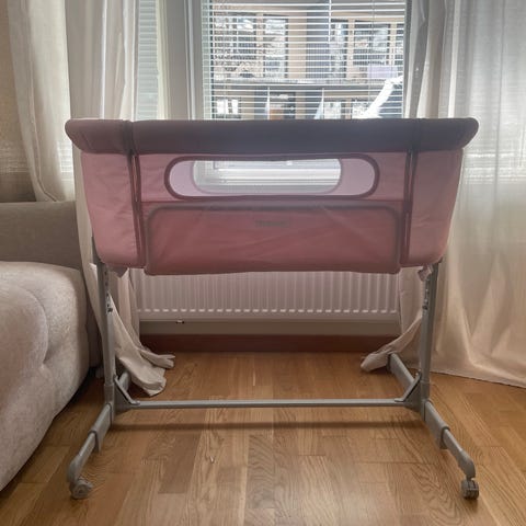 En bedside crib i bra skick! Perfekt för första tiden med spädbarn. Den är också väldigt smidig att montera ner och packa ihop för att ta med på resan eller om man ska sova borta.