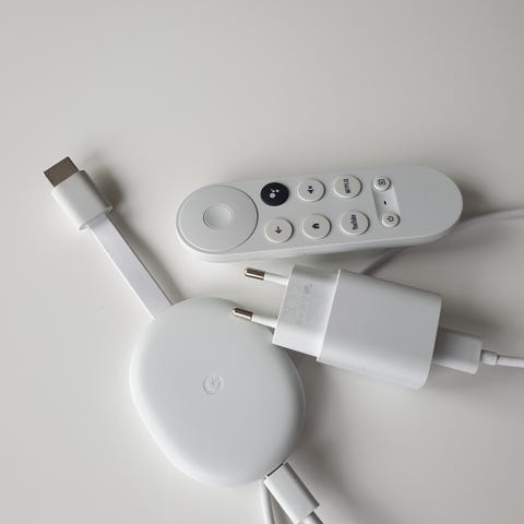 Google Chromecast med Google TV mediaspelare i vit färg. Enheten ansluts till TV:n via HDMI och drivs med medföljande nätadapter och USB‑kabel. Fjärrkontroll med röststyrning via Google Assistant ingår. Produkten är avsedd för streaming av bild och ljud från olika appar och tjänster till TV:n över internet via Wi-Fi.