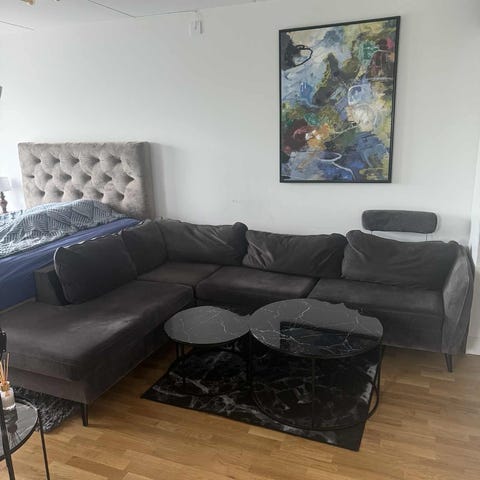 Säljer min Mio County 3-sits soffa med schäslong och divan i lyxig sammet Trento anthracite. En rymlig och mycket bekväm soffa som passar perfekt för både vardag och filmkvällar.