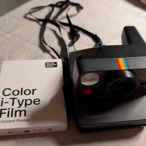 Polaroid Now instantkamera i vit färg. Kameran är en analog direktbildskamera som skriver ut bilder direkt på film efter exponering. På bilden syns kameran tillsammans med originalförpackning. Lämplig för vardagsfotografering, porträtt och ögonblicksbilder där fysiska foton önskas direkt vid fotografering.