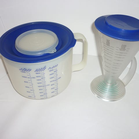 Måttkanna i plast med tydliga volym- och viktmarkeringar på utsidan. Utrustad med handtag för enkel hantering och pip för upphällning. Lämplig för mätning av både torra och flytande ingredienser i kök och bakning.