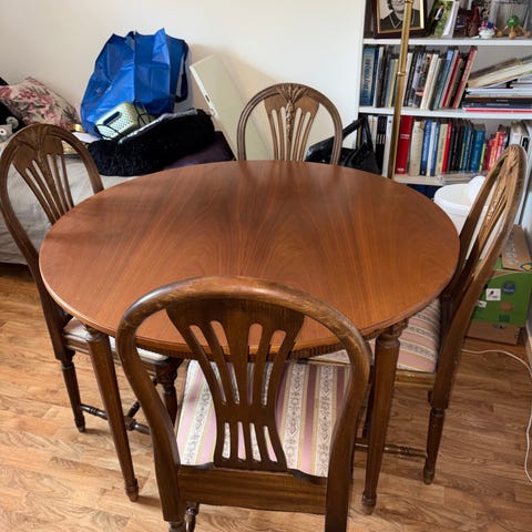 Säljer en charmig och gedigen matgrupp i mörkt trä med klassiska svängda ben, dekorativa sniderier och vackra detaljer. Bordet är flexibelt tack vare två iläggsskivor som gör det enkelt att anpassa efter behov.