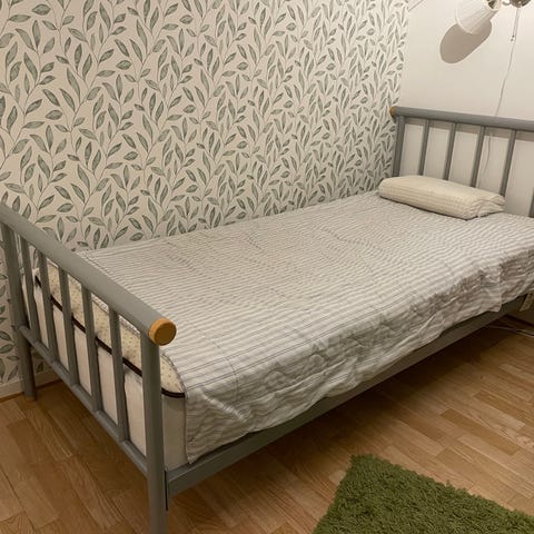 Bra skick, obehandlad furu. Ljust trä med fasta ribbor. Lite högre kant så madrassen stannar på plats. Hämtas på väster, Jönköping.