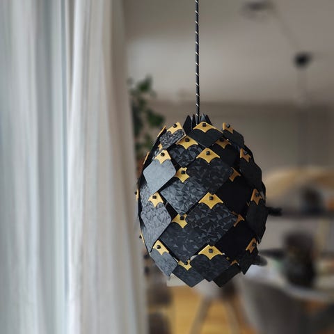 Taklampa med dekorativ lampskärm i brun trä imitation 3D-Printad.