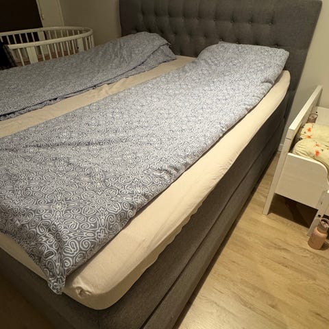 Kontinentalsäng, 180 cmx200 cm från R.O.O.M med sänggavel. Nypris: 17.000 kr. Ena sidan med fast madrass, ena sidan med medium madrass. Finns två uppsättningar ben (10 cm och 16 cm). Hund finns i hemmet. Jättefint skick (en lätt person som använt sängen). Bäddmadrass finns, dock fläckar på denna.
