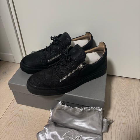 Säljer mina Giuseppe Zanotti Sneakers. Dem är svarta med dragkedjedetaljer på sidorna och snörning framtill. Skorna har en platt sula och en glansig detalj baktill.