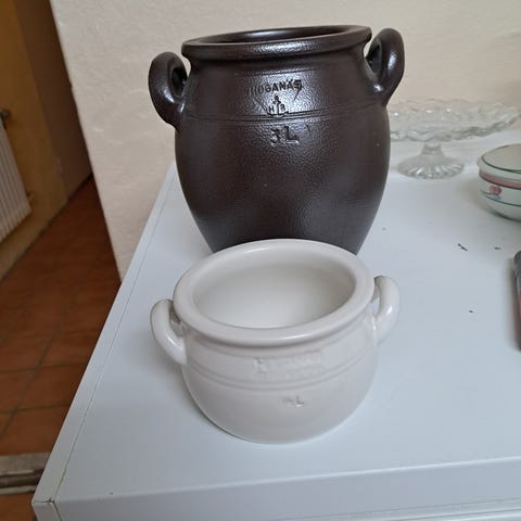 Grytkrukor i keramik i två färger, brun och svart. Krukorna har handtag på sidorna. Passar som förvaringskärl eller dekoration i kök eller andra rum. Volym 1 är för 10 L en för 12 L. 150:-/st