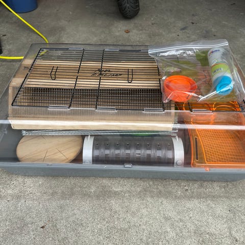 Följer med ett större hamsterhjul samt ett mindre, matskål och ny vattenflaska