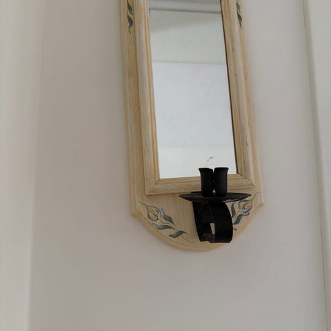 Spegel med hyllor i vit färg. Spegeln är monterad i en vit ram och har flera öppna hyllplan bredvid för förvaring eller dekoration. Passar exempelvis i sovrum, hall eller sminkhörna för kombinerad spegelfunktion och förvaringsyta.