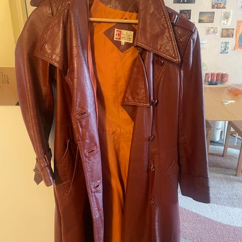 En snygg brun kappa i mycket fint rejält skinn och avtagbar cape. Innerfodret i mycket fint/bra skick. Vintage!