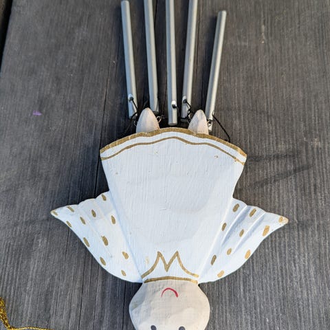 Hay humörmask som är vit med röda detaljer och svartmålade hår- och ögonbrynslinjer. Den har band för upphängning eller för att kunna bäras. Längd 27 cm, bredd 19 cm. Fint skick. Mindre nötning längst ned( se sista bild). Pris 150kr