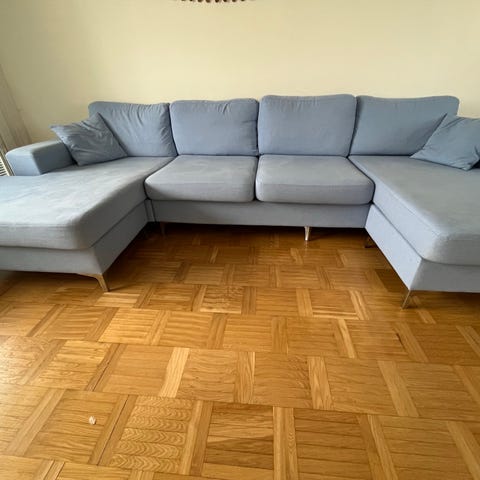 mörkgrå sammets klädsel, bredd 350 cm x 202 cm, divan 160 cm. inköpt på Chilli för ca 4 år sedan