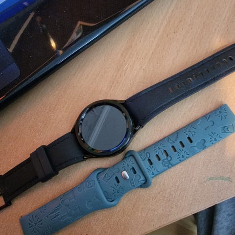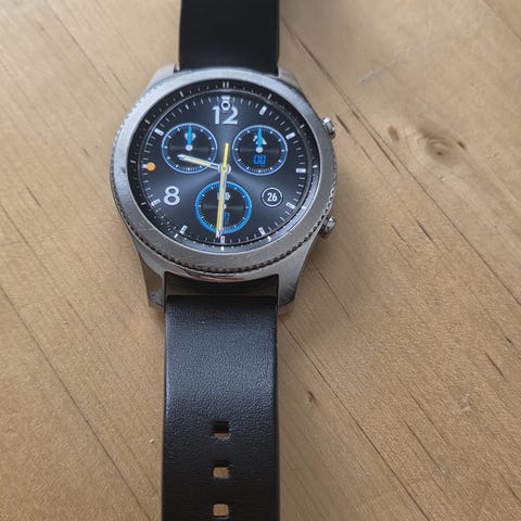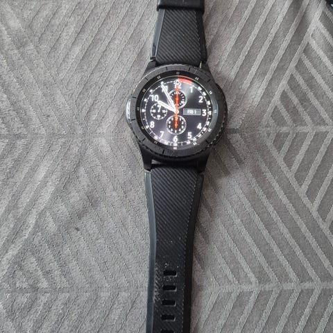 Samsung Gear s3 fronter smartklocka med rund svart boett. Klockan levereras med två utbytbara armband i olika färger, ett i neongrönt och ett i svart. Armbanden har traditionellt spänne och flera hål för justerbar passform. Inklusive laddstation, laddport miniusb. Produkten är avsedd att användas som smartklocka tillsammans med kompatibel mobiltelefon från Samsung eller andra märken som stöder denna typ av enhet före 2024.