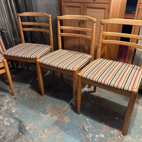 Vackra och rejäla stolar. Säljer alla 8 för 5000kr. Kryss i rygg och rotting sits.
