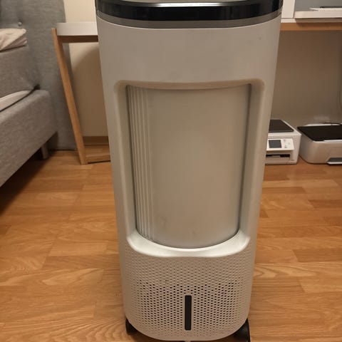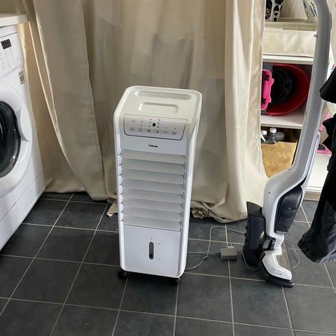 Nedis luftkylare i vit färg. Enheten har ett övre lock där vatten och kylklampar kan fyllas på, samt ett galler på baksidan för luftintag. På ovansidan finns en panel med flera funktionsknappar och indikatorer. Luftkylaren levereras med en matchande fjärrkontroll för styrning av funktioner på avstånd. Passar för användning inomhus för att ge svalare luft i exempelvis vardagsrum, sovrum eller kontor.