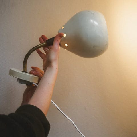 Vit bordslampa med justerbar, flexibel arm i metall. Lampan har strömbrytare på sladden. Sockel för E14-ljuskälla, max 25W enligt märkning.