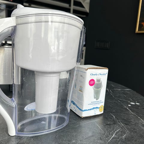 Aarke Purifier är en vattenfilterkanna i glas och rostfritt stål. Granulater ingår inte.