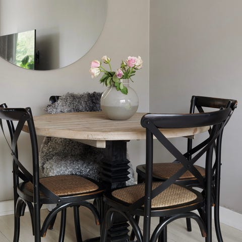 Bord (Gotham): Rund skiva i svartbetsad björkfaner med svarta metallben.