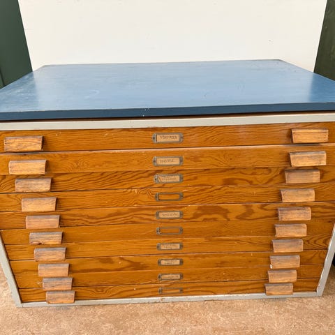 Trälåda med många små fack för väggförvaring. Lådan är rektangulär och försedd med ett stort antal olika stora fack som kan användas för förvaring eller exponering av små föremål. Tillverkad i trä med brun, något patinerad yta. Mått framgår av bilder med måttband. Lämplig som väggförvaring, sorteringslåda eller som dekorativ inredningsdetalj.