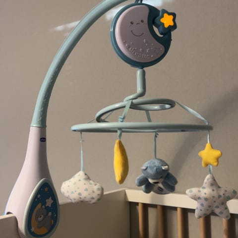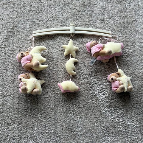 Säljer en jättefin och dekorativ babymobil i rosa och vitt med söta fjärilar och blommor i trä. Komplett med mobilarm