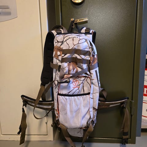 Vorn EV ryggsäck i grön färg. Ryggsäcken har vadderade axelremmar och höftbälte med justerbara remmar för bättre passform och bärkomfort. Utrustad med flera kompressionsremmar och fästpunkter på utsidan för extra utrustning. Lämplig för friluftsliv, jakt eller vandring där man behöver bära med sig packning på ryggen. Vart i skogen en gång. Säljes till förmån för annan Vorn.