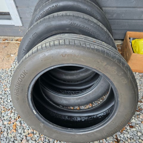 Däcken är jämnt slitna och utan synliga skador eller sprickor.