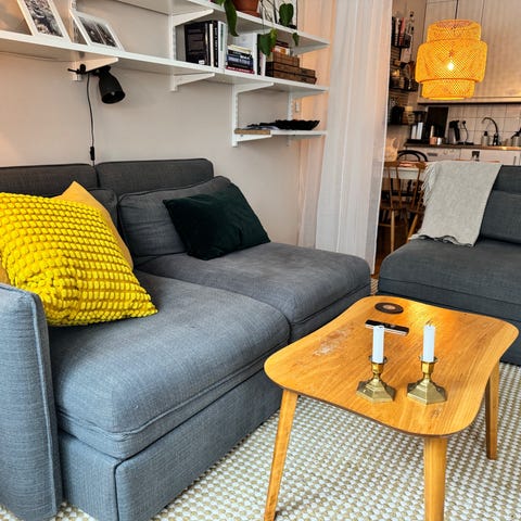 Rymlig 3-sitssoffa med divan. Ben i valnöt.