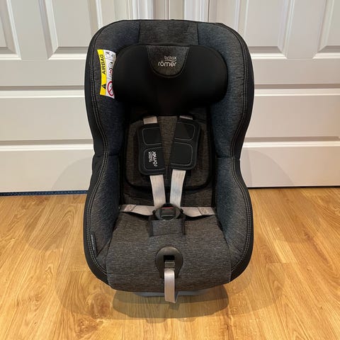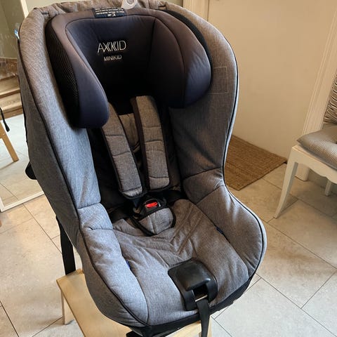 Axkid bilbarnstol för barn upp till 25 kg. Bakåtvänd montering enligt illustrationen på sidan av stolen. Utrustad med intern 5-punktssele och justerbart huvudstöd. Klädsel i grå textil med mörka detaljer. Passar som säkerhetsstol i bil för små barn inom angiven viktklass.