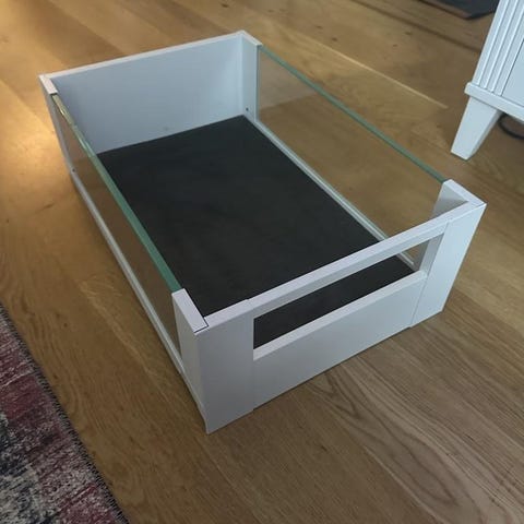 Dekorativ bricka i glas med svarta metallkanter. I fint skick. Mått: bredd ca 30 cm, djup ca 10 cm, höjd ca 6.5 cm.