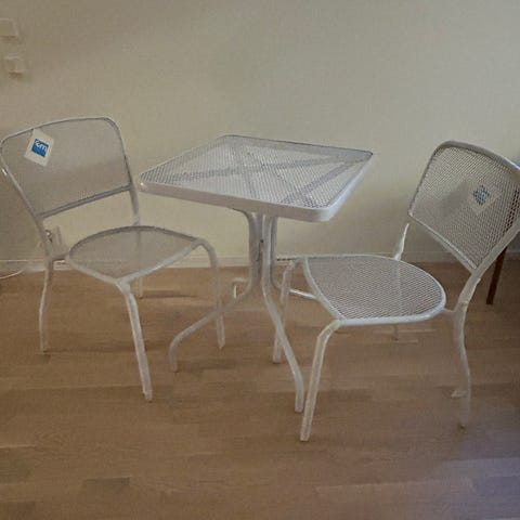 Möbelset från Fermob med runt bord (60cm) och tre stolar i metall. Setet är hopfällbart och passar för balkong, uteplats eller liten trädgårdsyta.