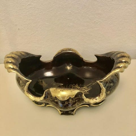 Bläckhorn för skrivbord med glasinsats och dekorativt metallställ. Bläckbehållaren är av glas med gångjärnsförsett lock i metall. Stället har mönstrad dekor och en plan yta framtill som kan användas som hållare för pennor eller små skrivtillbehör. Passar som skrivtillbehör eller inredningsdetalj i arbetsrum eller kontor.