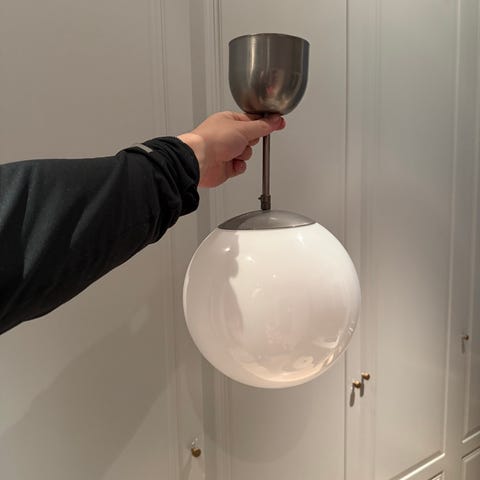 Taklampa med stomme i mässing och en kupa i vitt glas. Lampan hängs upp med kedjor.
