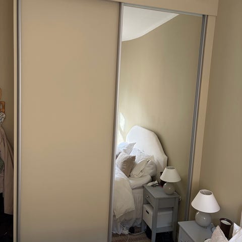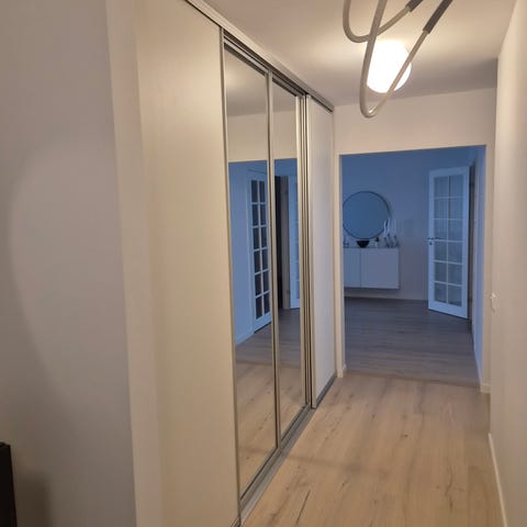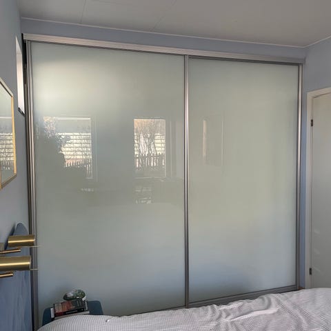 Garderobsdörrar med 2 skjutdörrar i träutseende och en med spegel.