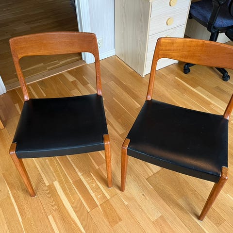 Teakstolar från 50-talet. Rangliga och behov av renovering men snygga och i bra skick för åldern. 4 stycken, 500 kr för alla.