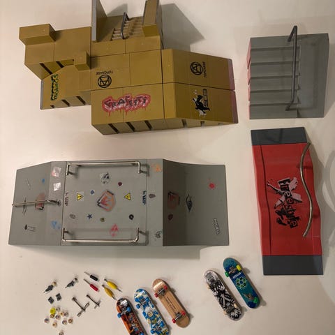 Tech Deck skateboardrampset med flera fingerboards. Setet består av en ramp med trappa och räcken samt flera små skateboards anpassade för fingrar. Passar för lek och övning av trick i mindre skala inomhus. Plastkonstruktion med tryckta motiv på brädorna.
