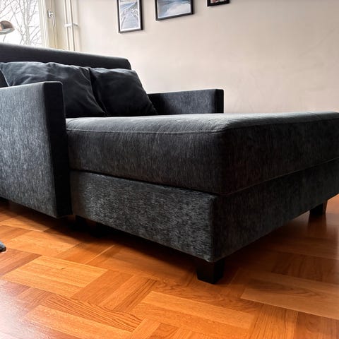 Svart fåtölj med fotapall. Fotpallen fungerar som praktisk förvaring.