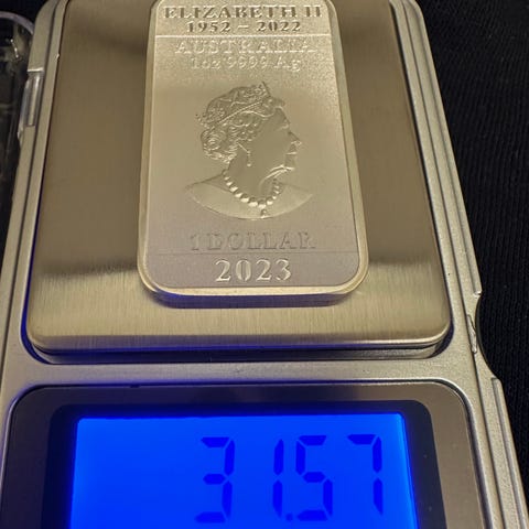 Rektangulär tacka med präglad logotyp och viktangivelse på framsidan. Serienummer är ingraverat längst ned på tackan. Lämplig som investeringsguld eller samlarobjekt.