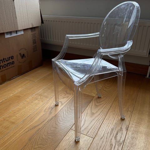 2 st. Lou Lou Ghost barnstolar i chrystal/klar/transparent. Formgiven av Philippe Starck för italienska Kartell. Stolen är tillverkad i tålig polykarbonat, vilket gör den både lätt för barnet att flytta själv och extremt slitstark. Den fungerar utmärkt vid skrivbordet, pysselbordet eller som snygg inredningsdetalj. Fint skick. Rök-/djurfritt hem.