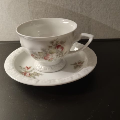 Stora tekoppar, porslinskål och glasskål