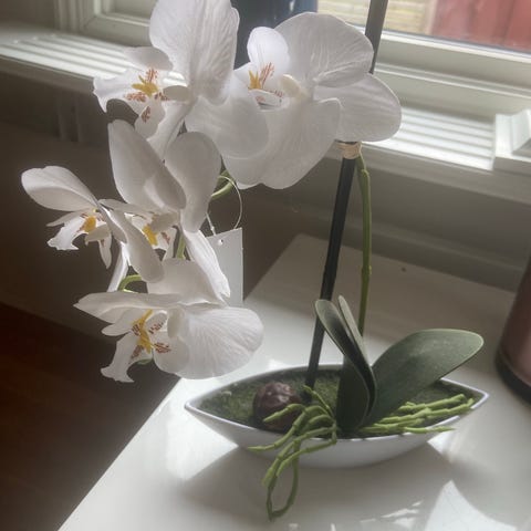 Vit vas med konstgjorda blommor i vitt och orange. Vasen har en slät, avlång form och står stadigt på plan yta. Blomarrangemanget består av flera olika typer av blommor i varierande höjd, vilket ger ett vertikalt uttryck. Passar som inredningsdetalj på bord, hylla eller fönsterbräda i hem- eller kontorsmiljö.Höjd 78cm