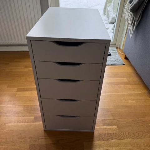 Säljer en byrå som använts för sminkbord, fungerar felfritt och har endast några estetiska defekter, inget som syns om man vill ha den under en skiva eller skrivbord.