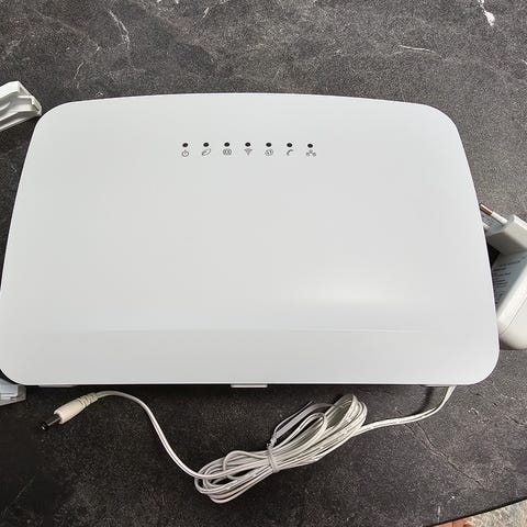 Telia router i vit färg. Enheten har flera LAN-portar på baksidan samt anslutningar för WAN och ström. På ovansidan finns indikatorlampor för status och uppkoppling. Routern passar för användning i hem eller mindre kontor för att fördela internetanslutning till flera enheter via nätverkskabel. Strömadapter ingår enligt bild.